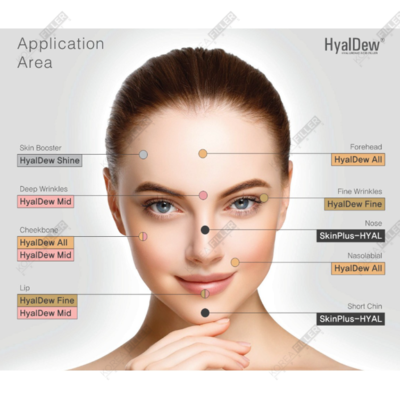 HyalDew All: With a small particle size of 420 um, HyalDew All offers good moldability and can be used for facial profiling and volumizing, improving deep expression lines such as nasolabial folds.