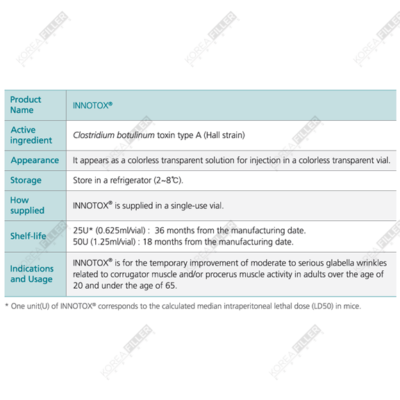 - Innotox is the first world’s type A botulinum toxin in the form of a finished liquid phase. This does not require breeding. One ready-made solution contains 50 units of the active substance. The product does not contain ingredients of animal origin, protein, albumin, and gelatin, which minimizes the risk of allergic reactions.