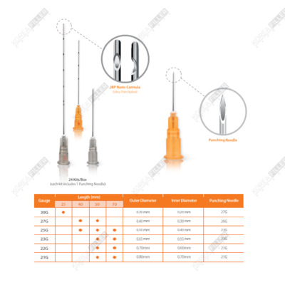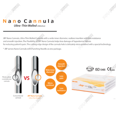 JBP’s Nano Cannulas are engineered to lessen patient discomfort, reduce the occurrence of hematomas, and decrease swelling. Their flexible design with a blunt tip ensures a smooth glide beneath the skin, preventing trauma. The innovative Micron Sharpness manufacturing technique produces an ultra-fine wall cannula, enabling the injection of thicker solutions through a tinier opening, which further reduces pain and bleeding. The objective is to decrease the surface area, ensuring minimal soft tissue disturbance and resulting in happier patients.