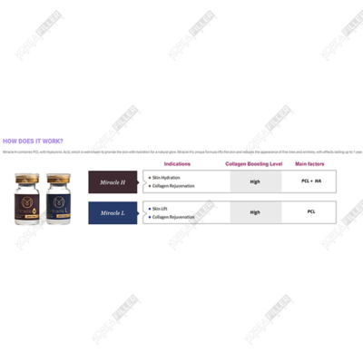 - Miracle L is a highly effective PCL-based booster that promotes deep skin rejuvenation and lifting. Its main component, polycaprolactone (PCL), stimulates collagen synthesis on a molecular level, resulting in increased skin elasticity, reduction of wrinkles, and overall facial contouring. The product’s effects become visible within a week of injection and can last up to a year. In addition to its lifting and rejuvenating properties, Miracle L is also effective in skin whitening, improving skin tone, and providing general recovery and moisturization. It can be used both as a prophylactic measure against age-related changes and for the restoration of skin damaged by prolonged exposure to UV radiation.