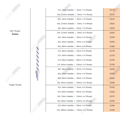 S2360 23G 60mm 90mm 3-0, S2390 23G 90mm 150mm 3-0, S2550 25G 50mm 70mm 4-0, S2560 25G 60mm 90mm 4-0, S2570 25G 70mm 110mm 4-0, S2590 25G 90mm 150mm 4-0, S2638 26G 38mm 50mm 5-0, S2650 26G 50mm 70mm 5-0, S2660 26G 60mm 90mm 5-0, S2690 26G 90mm 150mm 5-0, S2738 27G 38mm 50mm 5-0, S2750 27G 50mm 70mm 5-0, S2760 27G 60mm 90mm 5-0, S2790 27G 90mm 150mm 5-0, S2925 29G 25.4mm 30mm 6-0, S2938 29G 38mm 50mm 6-0, S2950 29G 50mm 70mm 6-0, S2960 29G 60mm 90mm 6-0, S3018 30G 18mm 30mm 7-0, S3025 30G 25.4mm 30mm 7-0, S3038 30G 38mm 50mm 7-0, S3112 31G 12mm 16mm 7-0, S3125 31G 25.4mm 30mm 7-0