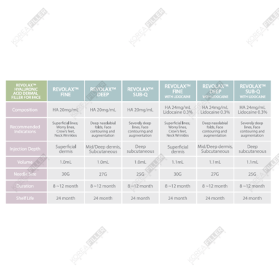 Revolax Sub-Q with Lidocaine is the thickest filler in the Revolax product range and is primarily used for augmenting the cheek, chin, nose, and jawline areas. It is the most long-lasting dermal filler in the Revolax range, but can be easily dissolved with Hyaluronidase if needed.