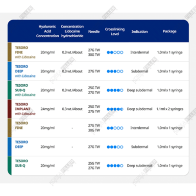 • Tesoro Fine and Tesoro Fine Lidocaine are designed to provide a slight increase in volume to the lips, achieving a “kissed lips” look, as well as correcting superficial wrinkles around the eyes, lips, and hands.